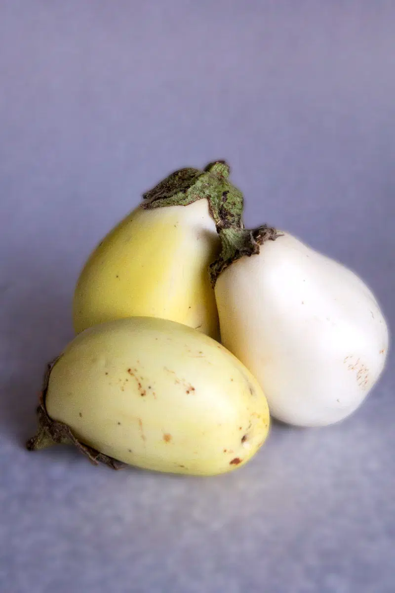 We got these interesting white eggplants in our CSA last week and we finally got around to using them. They held on very well in a brown paper bag in our pantry for that time.