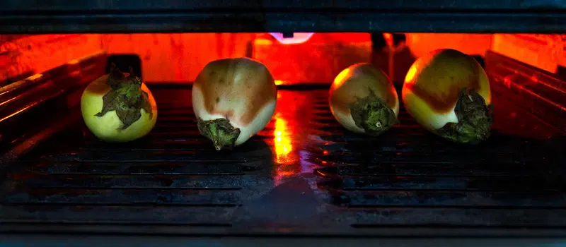 I usually make this with the large purple eggplants you find in the typical american supermarket. But with our CSA we had these little ones. The first step is to cook the eggplant. I usually slice them and salt them with a course salt to pull the water out and then cook them in water, a technique I learned from Alton Brown’s Good Eats. But Puja likes to roast them whole on the burner which is faster and less messy. With these little eggplants, I thought I’d do it her way, but use the broiler instead of the burner.