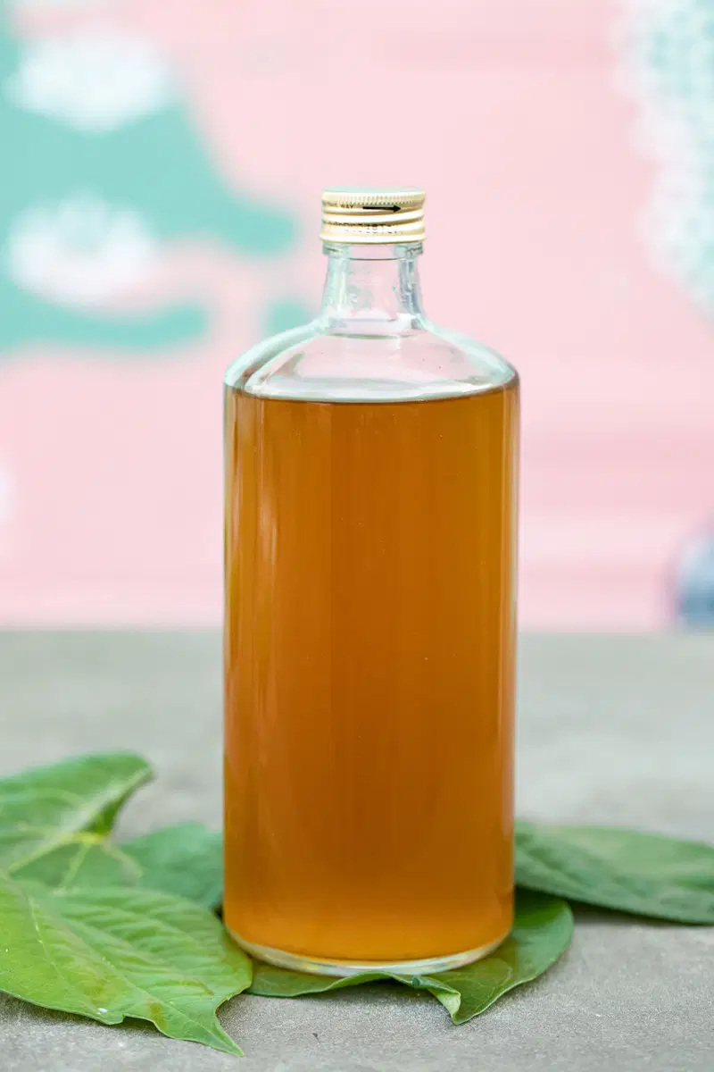 - Pour into your final storage container, running it through a sieve to remove the leaves and spices.