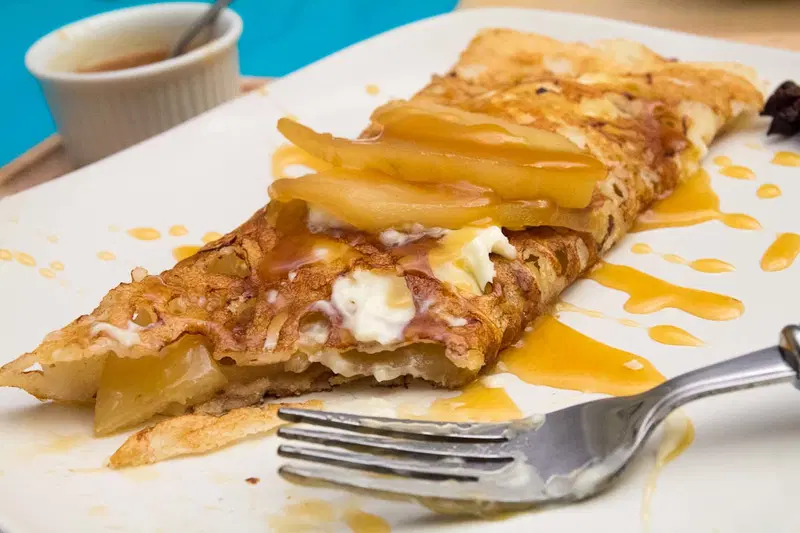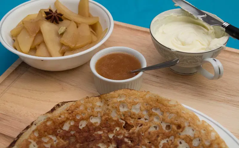 Sweet Rava Dosa with Pear Compote, Mascarpone, and Coconut Rum Caramel Sauce