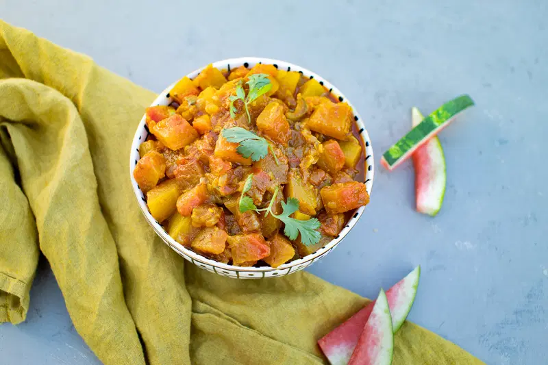 Kalingar nu shaak, or watermelon rind curry, is a traditional Gujarati curry and a great way to fight food waste. Who hasn’t stared at those uneaten rinds of watermelon and wondered if there were something that could be done rather than throwing it all away?